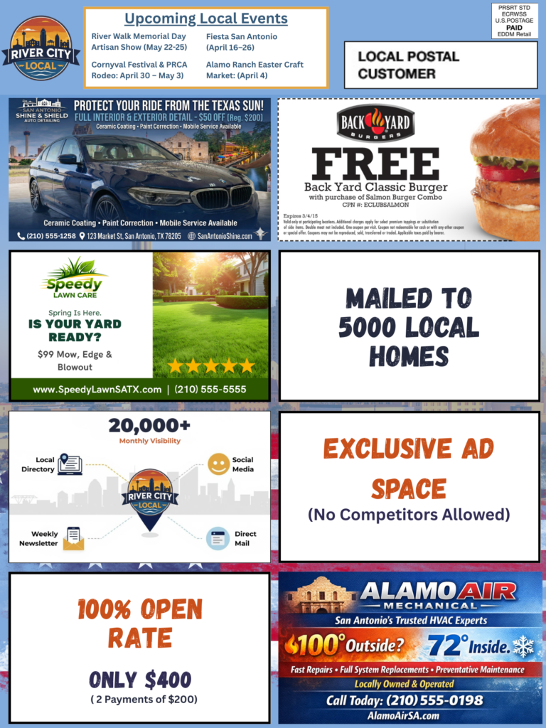 A full-color jumbo postcard that lands in 5,000 mailboxes across your target neighborhood every 45 days. Real mail. Real hands. Real results. Your ad is designed for you, your category is locked exclusively, and your business gets featured across our social platform at the same time.